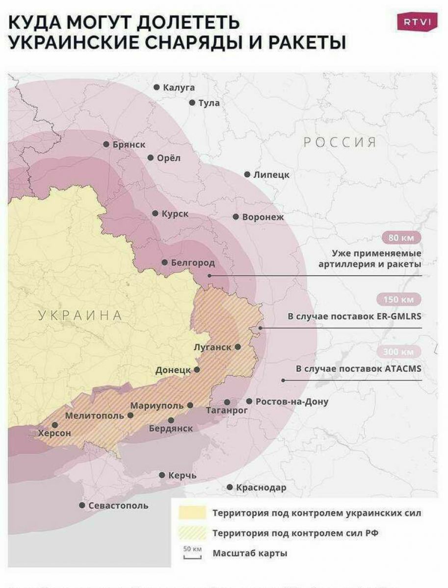 Telegram-канал «Русское оружие» опубликовал карту возможного поражения российских территорий после поставки на Украину дальнобойных ракет ATACMS, которые появились там совсем недавно. В них попала и значительная часть территории Липецкой области.