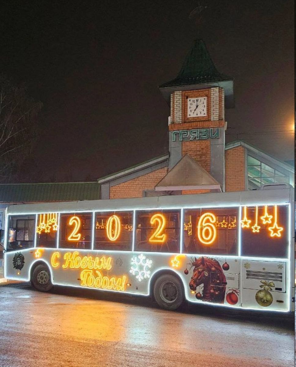 Это праздничный домик на колёсах. Внутри – уютный «камин», сверкающие гирлянды, светодиоды, Снегурка и даже свой олень. Звучит музыка, а за рулём – настоящий Дед Мороз. Диковинный автобус колесит по городским маршрутам, радуя грязинцев и гостей города и одаривая всех, особенно детей, новогодним настроением.