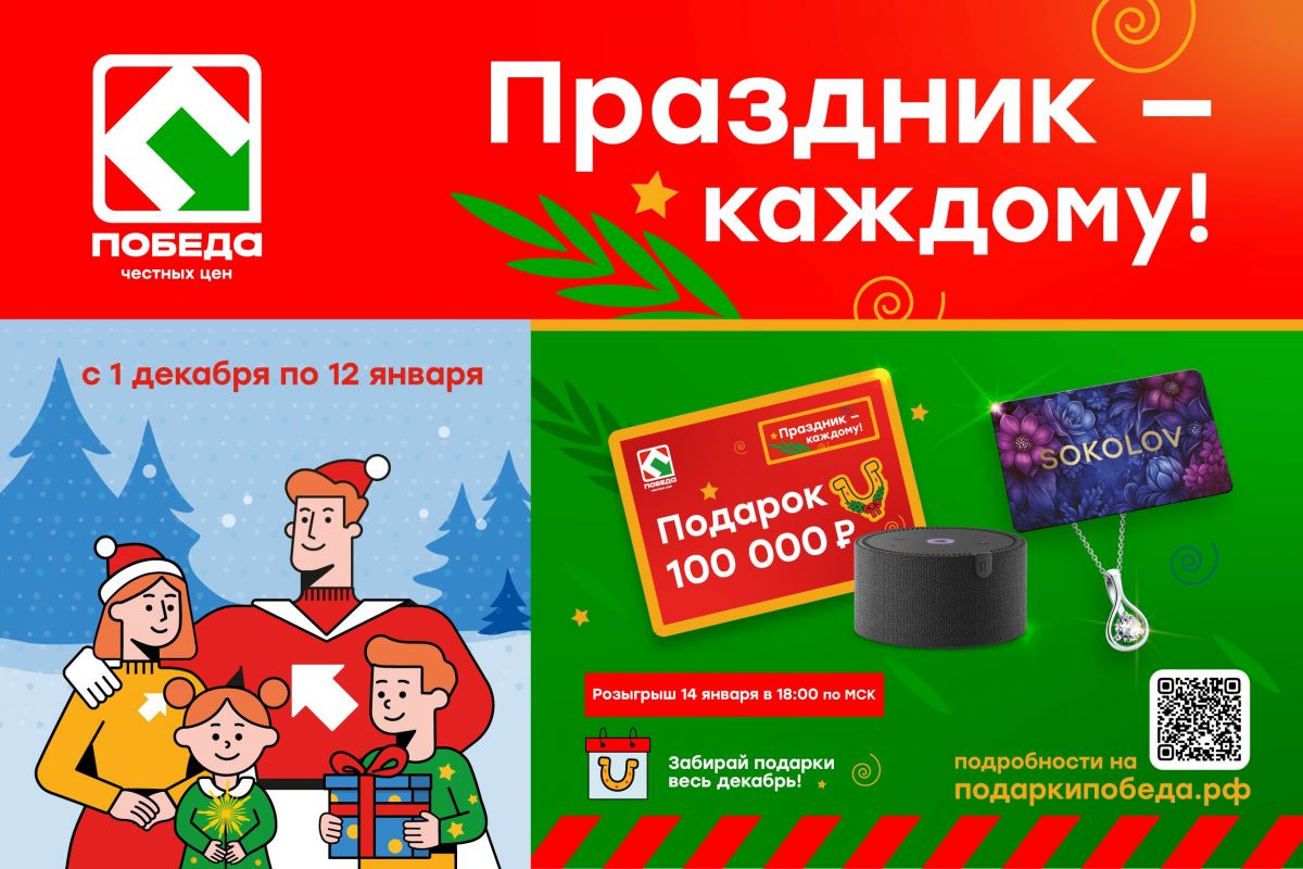 Скоро наступит самый волшебный и долгожданный праздник - Новый год! Время чудес, исполнения желаний и, конечно же, подарков, которые согревают сердце и заставляют улыбаться. А что если праздник продлится немного дольше? Сеть дискаунтеров ПОБЕДА дарит вам настоящее новогоднее чудо, до 12 января включительно действует акция «Праздник - каждому!» Каждый день вы можете испытать радость, открывая заветные окна в «Календаре подарков» на сайте подаркипобеда.рф и получать призы!