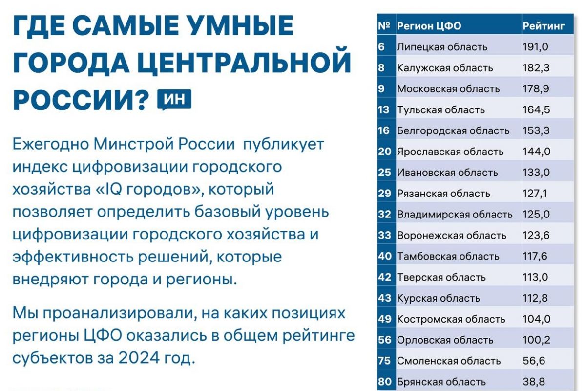 Внутри страны уровень цифровизации городов устойчиво растет. По данным Минстроя России на 2024 год, среднее значение индекса «IQ городов» увеличилось на 40% по сравнению с базовым уровнем 2018 года. Лидеры рейтинга – Москва, Санкт-Петербург и Казань. Липецкая область в этом рейтинге демонстрирует высокий результат, занимая 6-е место среди всех регионов страны.
