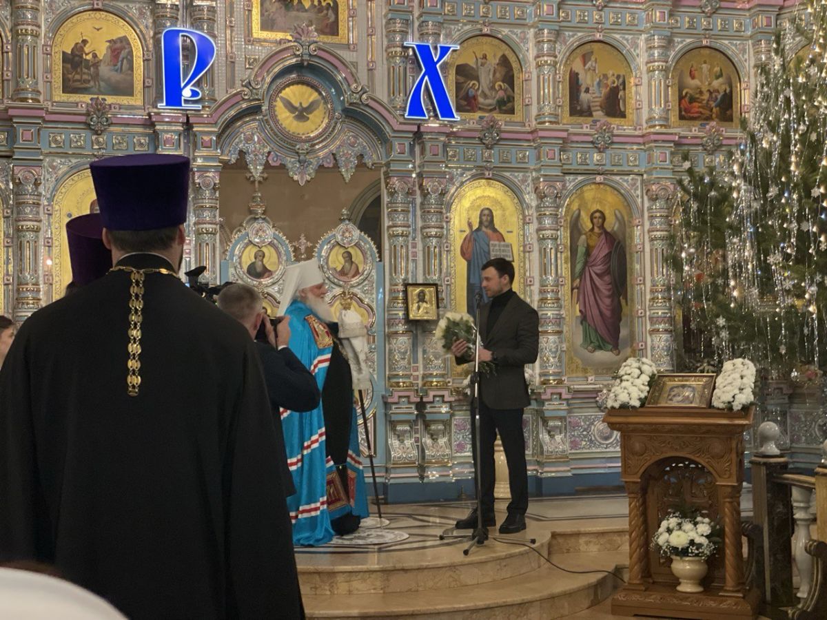 На солею вышел Александр Рябченко. Митрополит Арсений поблагодарил власти региона за помощь участникам СВО и их семьям, приходам митрополии и воскресным школам, вручил рождественские подарки, в ответ господин Рябченко рассказал о трогательном чуде в своей семье, когда благодаря вере и молитве надежда на появление ребенка благополучно завершилась рождением дочери.