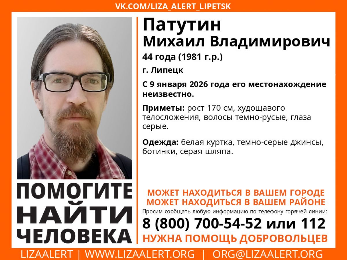 В Липецке ищут 44-летнего Михаила Патутина. По информации поискового отряда «ЛизаАлерт», его местонахождение неизвестно с 9 января.
