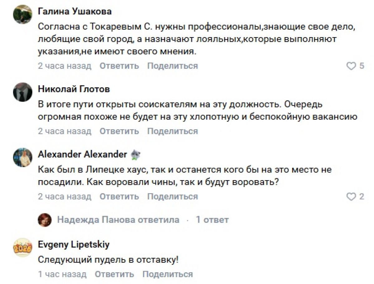 В своём телеграм-канале он сообщил, что подал заявление об отставке, которое будет рассмотрено на ближайшей сессии Липецкого городского Совета депутатов. «Новости Липецка» приводят некоторые комментарии без цензуры и прикрас.