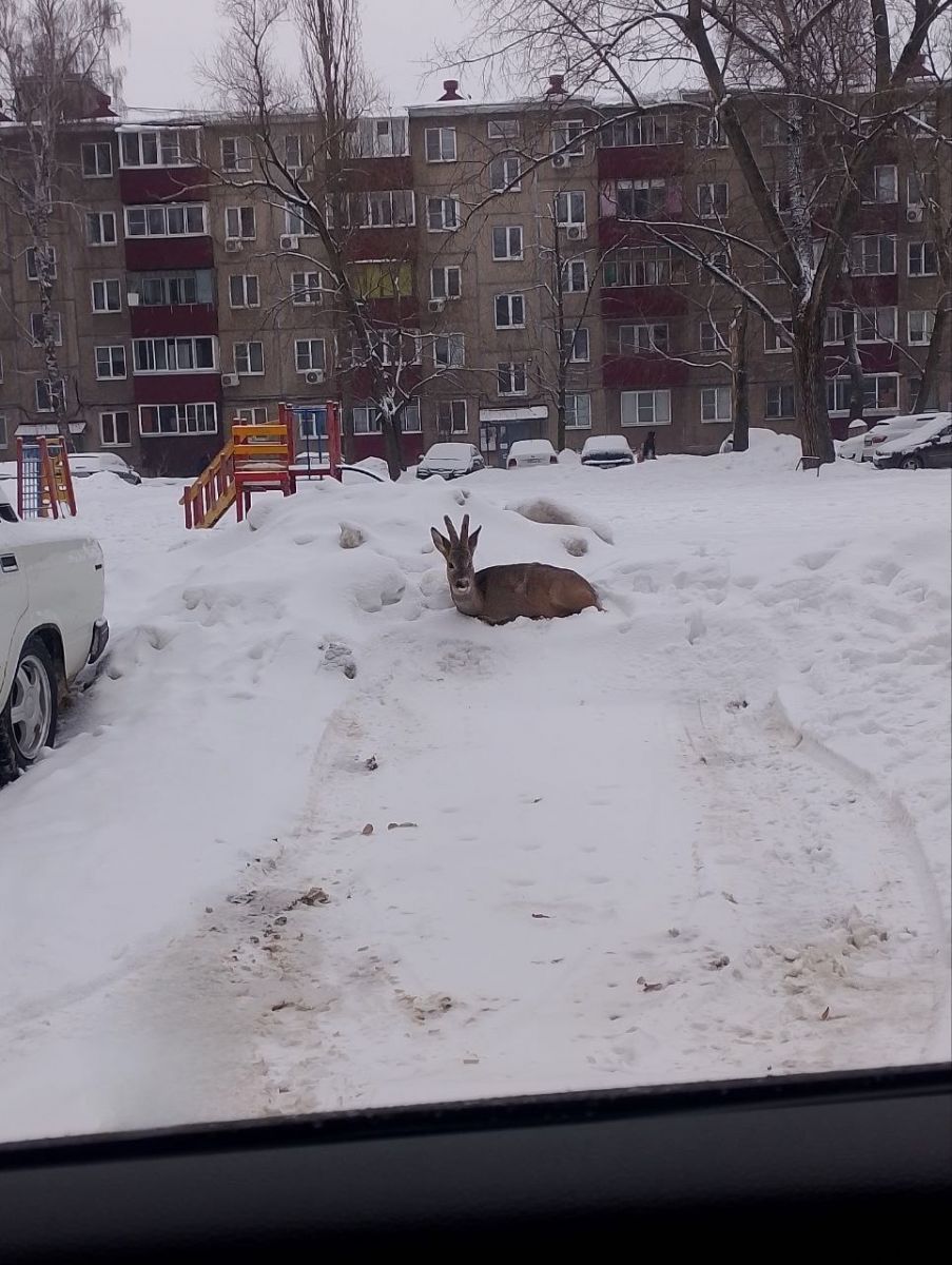 Дикая косуля отдыхает в сугробе посреди Липецка в районе Гагарина и Космонавтов