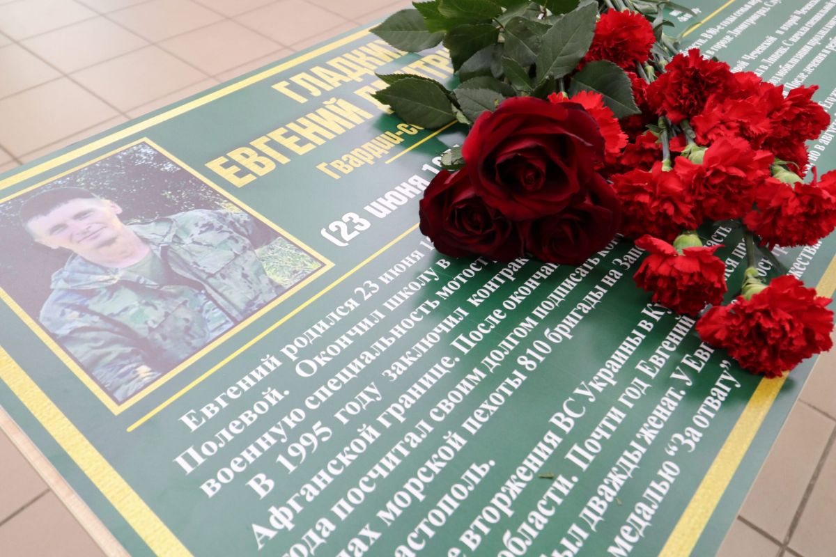 В лицее села Долгоруково Липецкой области открыли «Парту героя» в честь бывшего ученика Евгения Дмитриевича Гладких. Он служил в горячих точках, а в ходе СВО получил медаль «За отвагу» и орден Мужества.