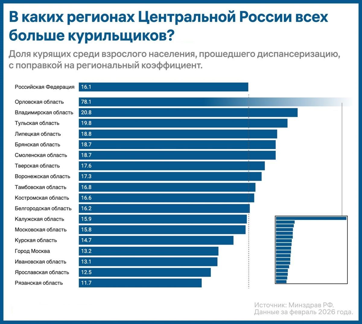 Минздрав России опубликовал данные о распространенности вредных привычек среди взрослого населения. Согласно статистике ведомства, доля курящих жителей в Липецкой области составляет 18,8%. Этот показатель был рассчитан на основании данных диспансеризации с учетом региональных коэффициентов.