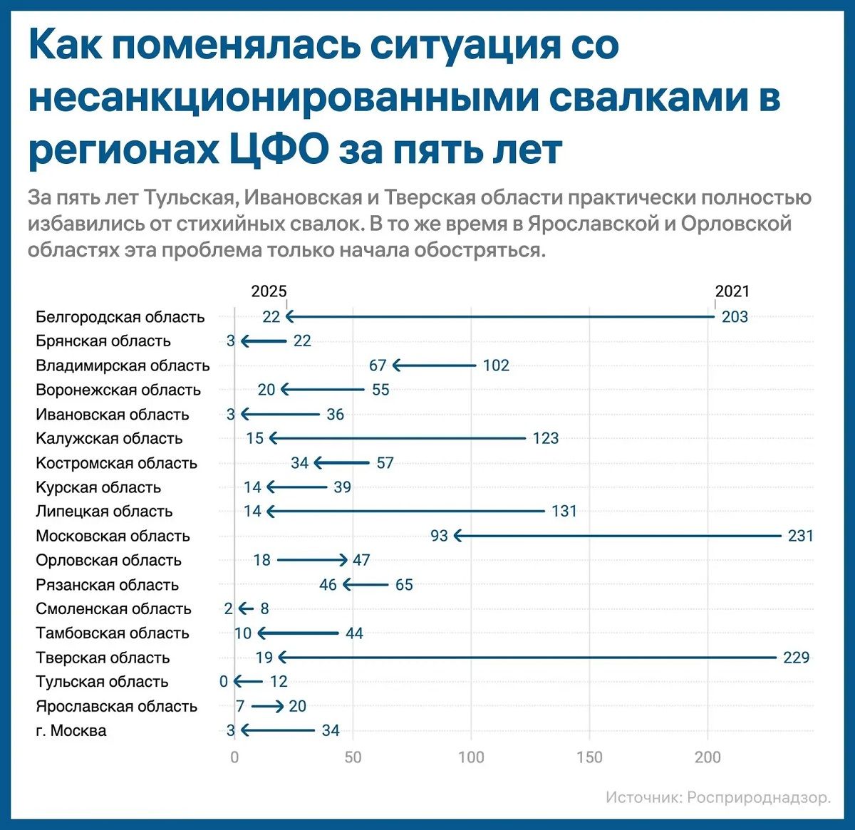 В Центральном федеральном округе Липецкая область демонстрирует положительную динамику. Аналогичные успехи есть и у соседей: например, с проблемой полностью покончили в Тульской области. Однако не всем регионам удалось похвастаться такими результатами. Так, в Ярославской области число свалок выросло на 186%, а в Орловской — на 161%.