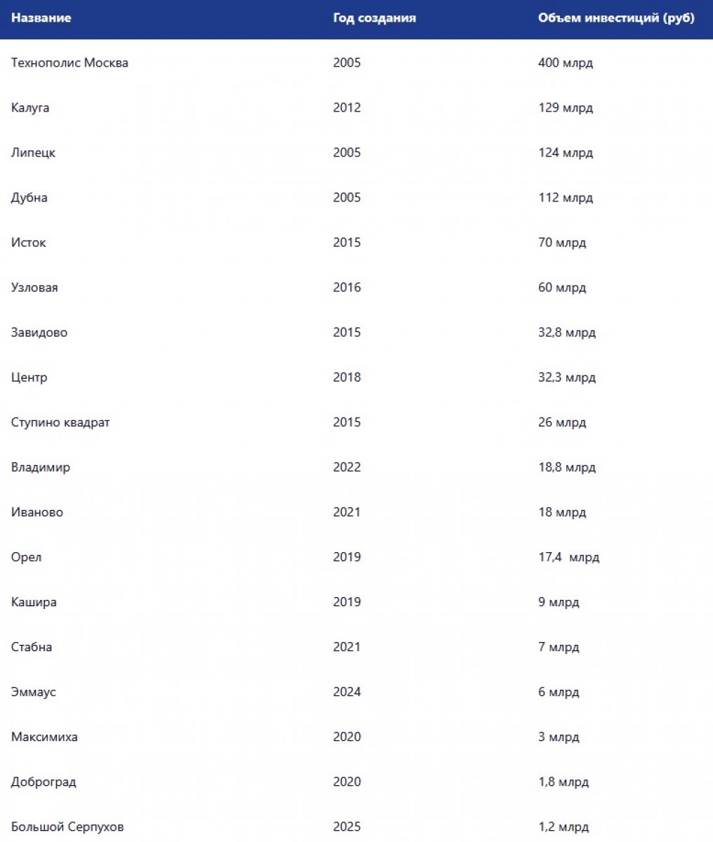 Первенство в рейтинге заняла особая экономическая зона «Технополис Москва». За два десятилетия она превратилась в флагмана высокотехнологичной промышленности: объём привлечённых инвестиций превысил 400 млрд рублей, а количество созданных рабочих мест достигло более 28 тысяч. Будучи зоной технико‑внедренческого типа, «Технополис» особенно привлекателен для инвесторов, работающих в этой нише.